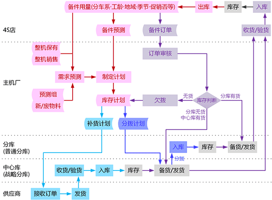 - SLS物流运作涵盖范围广,不但包括主机厂、4S店或维修站,还包括供应商、中心库(战略分库)和分库(普通分库)。